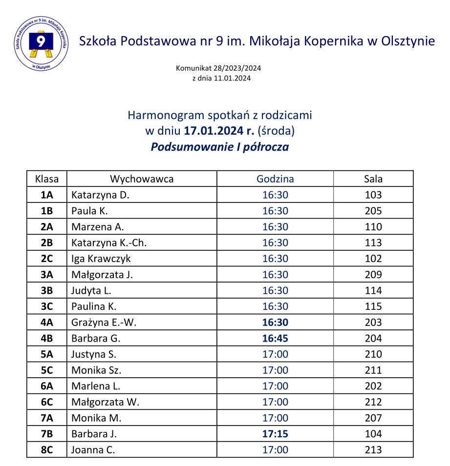 Harmonogram spotkań z rodzicami
