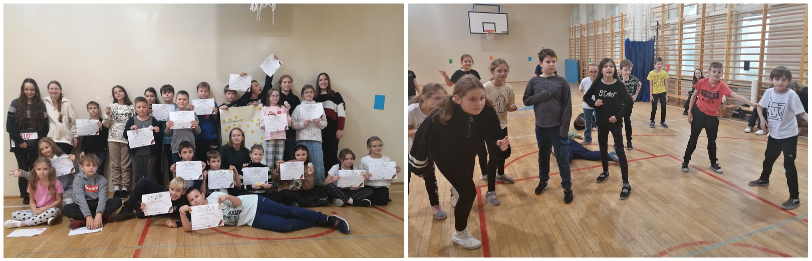 Dnia 16.10.2023 r. klasy czwarte uczestniczyły w zajęciach ruchowo-językowych „Beweg dich! – Rusz się!” Zajęcia na temat aktywnego spędzania wolnego czasu poprowadziły absolwentki naszej szkoły Amelka i Ala oraz ich koleżanki z grupy ELOm, nad którą patronat ma m.in. Dom Współpracy Polsko-Niemieckiej.