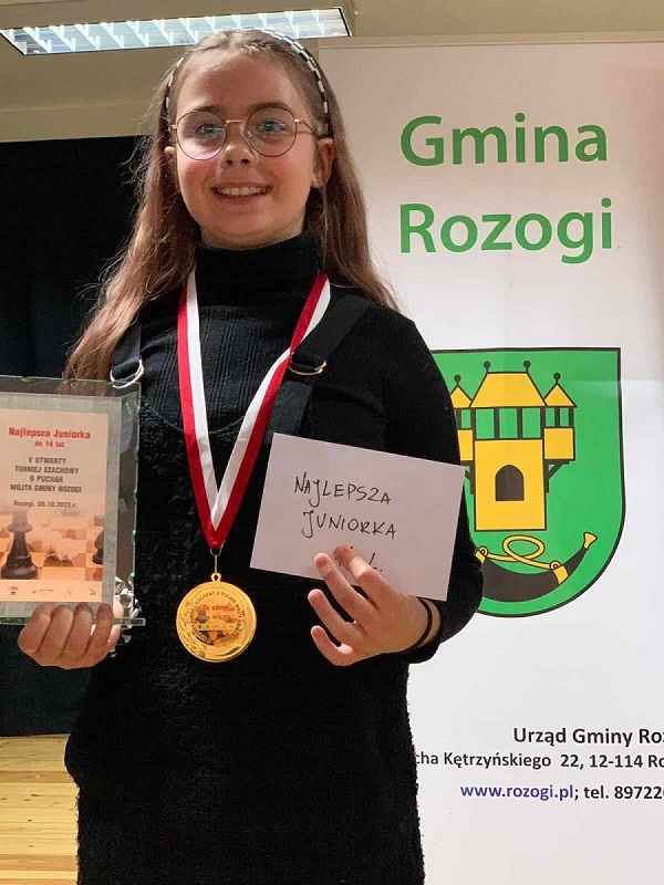 Amelia stale próbuje swoich sił w turniejach szachowych i jak widać wychodzi Jej Nasza Uczennica, 8 października br. otrzymała miano "Najlepszej Juniorki do 14 lat" na Turnieju Szachowym o Puchar Wójta Gminy Rozogi, a przecież Amelia to dopiero 4-klasistka. Tak trzymaj! |