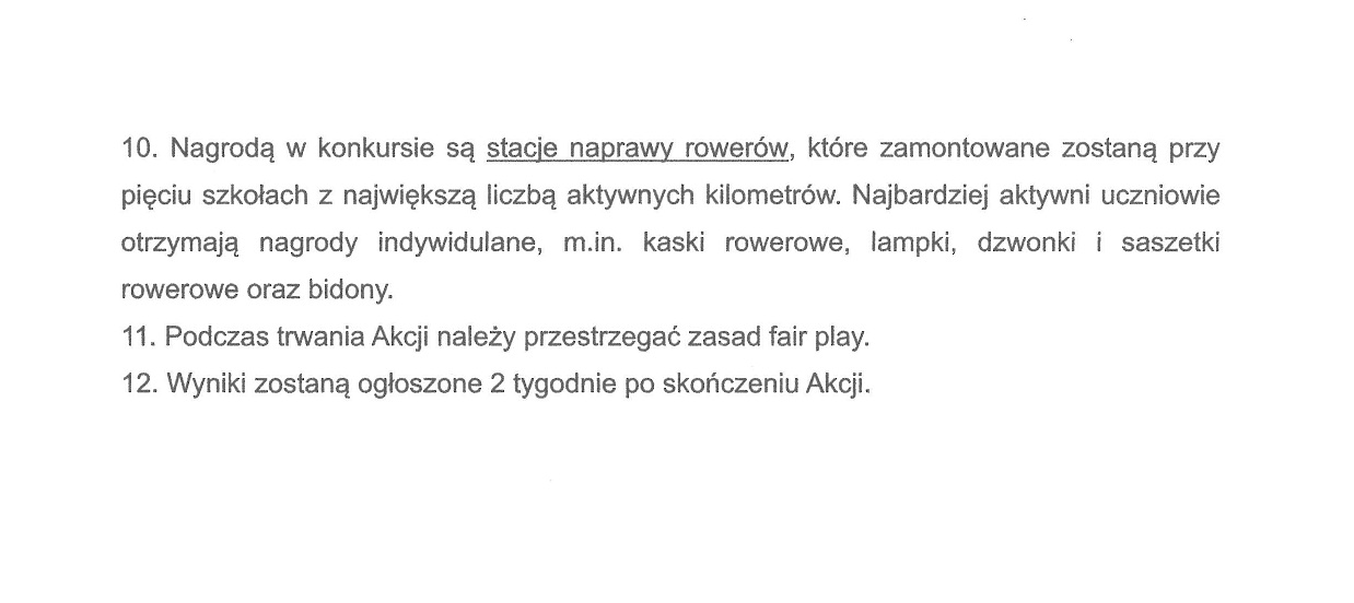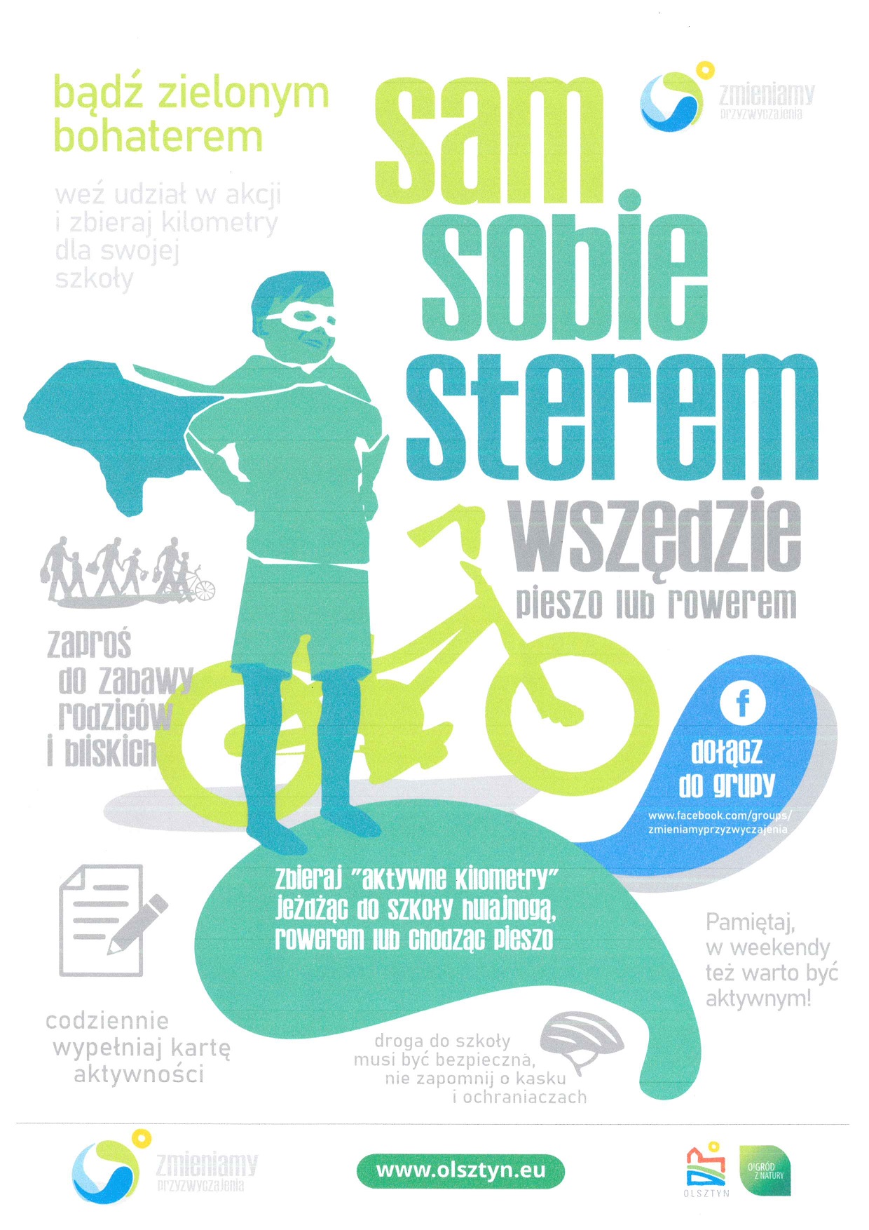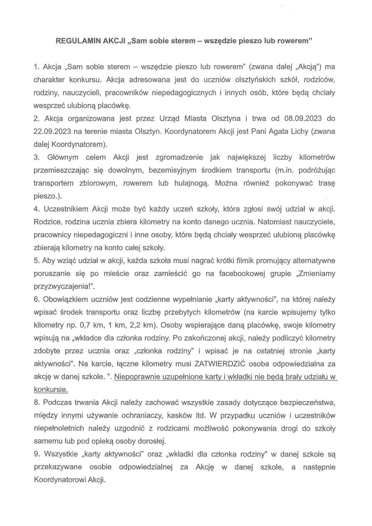 Nasza szkoła bierze udział w akcji - konkursie "Sam sobie sterem - wszędzie pieszo lub rowerem". Jest to rywalizacja olsztyńskich szkół. Celem akcji jest zgromadzenie jak największej liczby kilometrów przemieszczając się dowolnym bezemisyjnym środkiem transportu (mi.in. podróżując transportem zbiorowym, rowerem lub hulajnogą. Można również pokonać trasę pieszo). Akcja trwa od 08.09.2023 do 22.09.2023. W akcji mogą brać udział uczniowie, nauczyciele, pracownicy szkoły oraz rodzice. Uczniowie, którzy chcą wziąć udział w akcji zgłaszają się do nauczycieli WF-u po odbiór „kart aktywności”. Przy 5 szkołach z największą liczbą aktywnych kilometrów zostaną zamontowane stacje naprawy rowerów, a najbardziej aktywni uczniowie otrzymają nagrody indywidualne m.in. kaski, lampki, dzwonki, bidony oraz saszetki rowerowe.