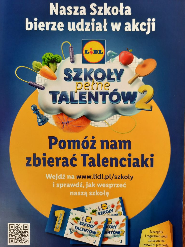 Akcja rozpoczyna się 01.09.2023 - potrwa do 5 listopada 2023r., będzie polegała na przekazywaniu Talenciaków (specjalnych kuponów) na rzecz wybranej szkoły. Talenciaki będą otrzymywali Państwo podczas zakupów w Lidlu (za każde wydane 50 zł w tym jedno warzywo lub owoc przysługuje jeden Taleciak).